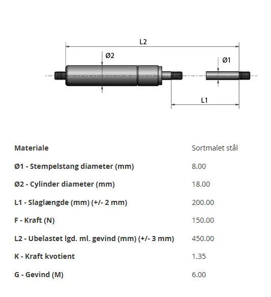 Stempelstang: C35R. Cylinderen er malet med halvblank, sort maling, og stempelstangen har fået en plasma-nitrider-behandling, der gør overfladen meget slidstærk og giver den moderat rustbeskyttelse. Behandlingen kan dog ikke erstatte en decideret rustfri gasfjeder.