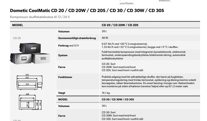 Kompakt kompressorkøling fra Dometic til indbygning. Med den aftagelige køleskuffe, kan du nemt og bekvemt placere skuffen op til 1,5 meter væk, for nemmere adgang. Skuffen kan indeholde ca. 20 liter og har en køleevne fra 0 til +15 grader med den manuelle termostatstyring.