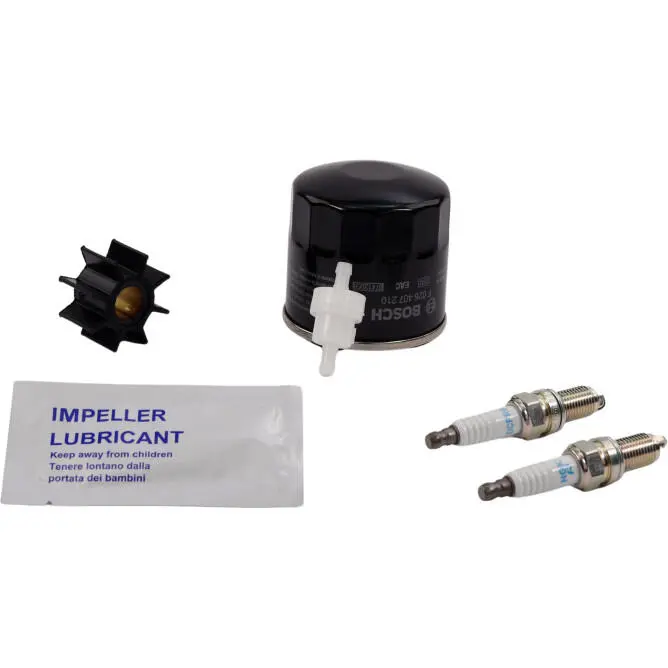 Komplet servicekit til Mercury 15 og 20 HK indeholder oliefilter, brændstoffilter, tændrør, impeller, gearoliepakninger samt 5 gram fedt.