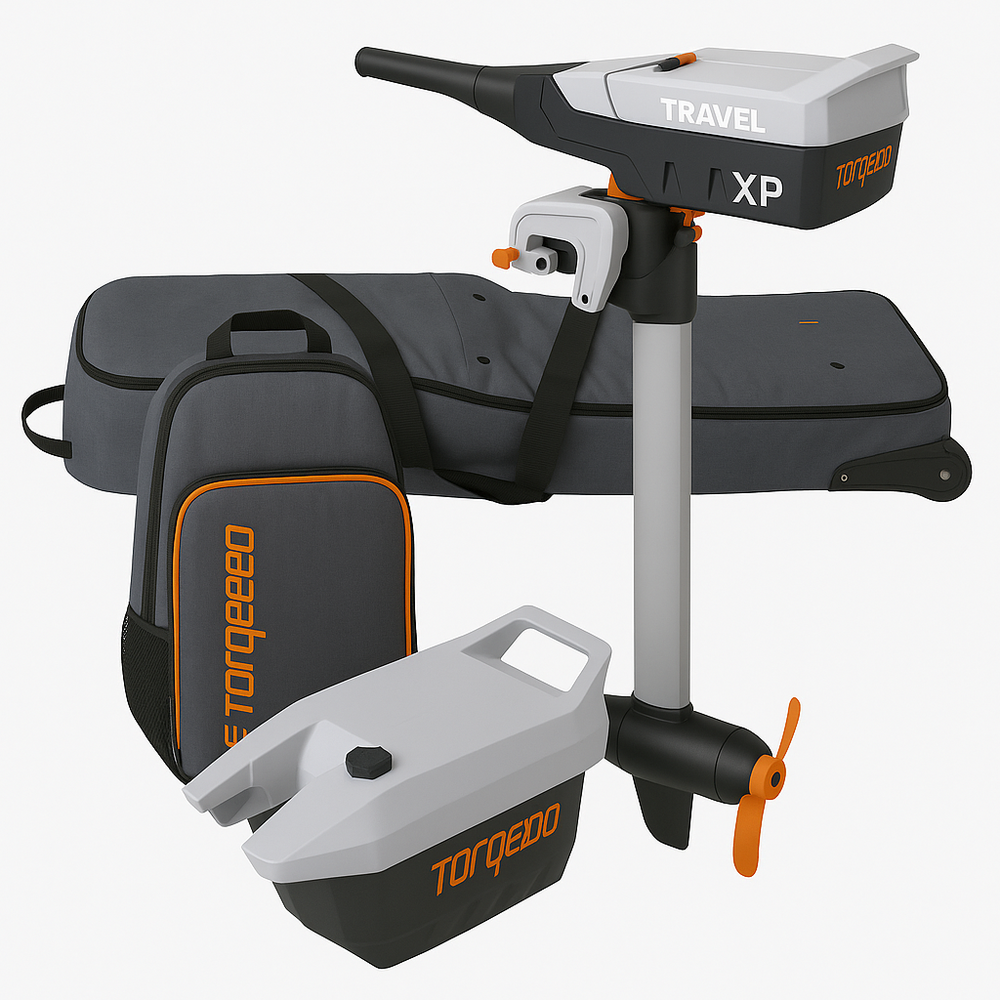 Komplet pakkeløsning til Torqeedo Travel XP med rorpindsstyring, inkl. original transporttaske-sæt og tilbehør, der gør det let at transportere og opbevare motoren sikkert.